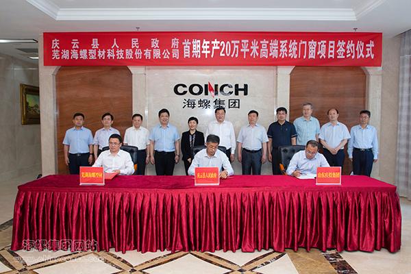 2020年6月2日,海螺型材與德州市慶云縣人民政府在海螺集團總部簽署了年產(chǎn)20萬平方米高端系統(tǒng)門窗項目協(xié)議。海螺集團黨委書記、董事長高登榜,集團副總經(jīng)理、海螺型材董事長萬涌,集團紀(jì)委書記吳小明,德州市副市長張桂愛等出席并見證簽約儀式。海螺型材總經(jīng)理王楊林、慶云縣縣長孫洪昌、山東慶投控股集團董事長王鐵峰現(xiàn)場簽約。