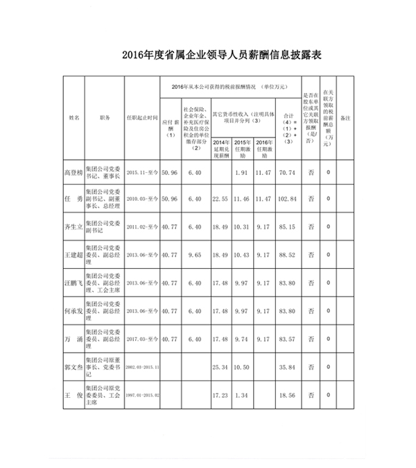 2016年度省屬企業(yè)領導人員薪酬信息披露
