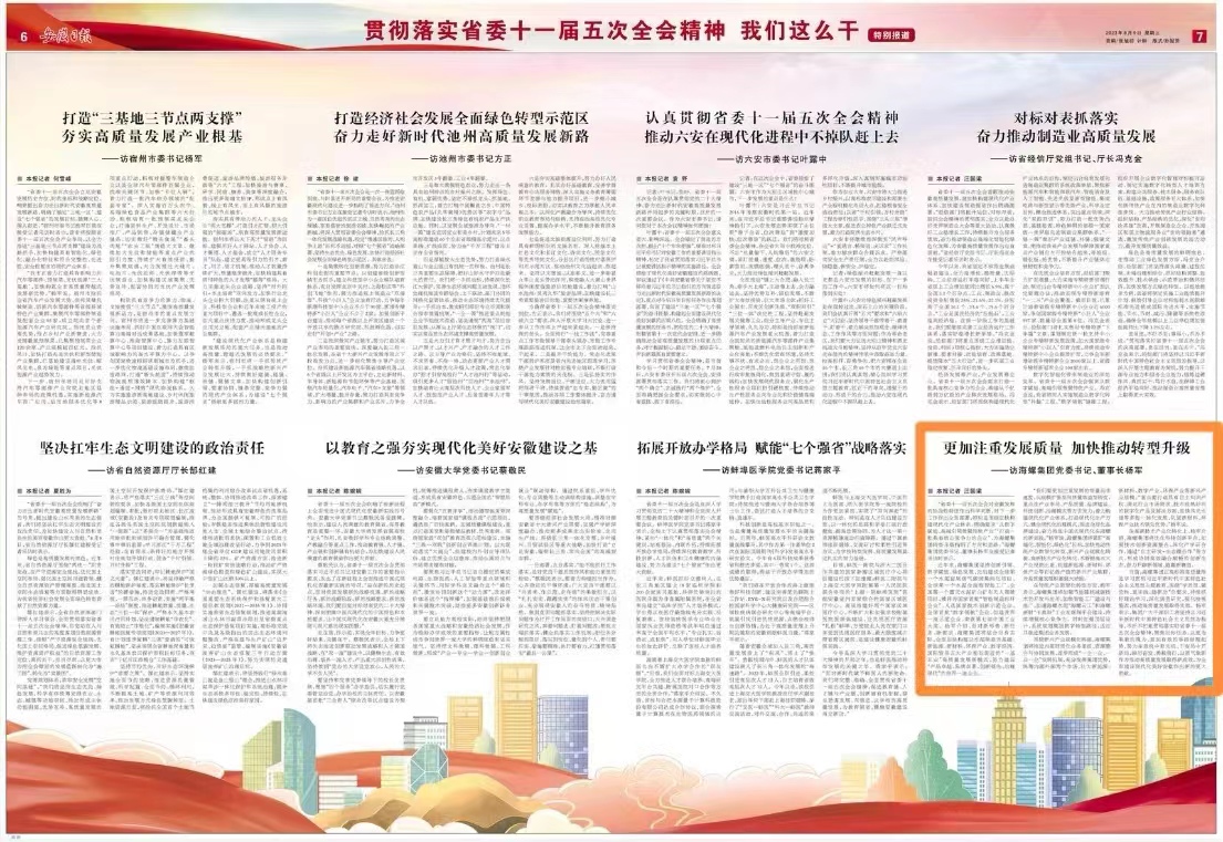 《安徽日報》貫徹落實省委十一屆五次全會精神特別報道,專訪海螺集團黨委書記、董事長楊軍。