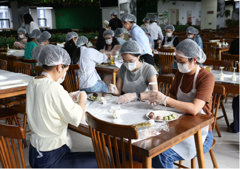 在掌握了基本要領(lǐng)后,員工們紛紛洗凈雙手,系上圍裙,興致勃勃地投入到月餅制作中。盡管很多人都是第一次嘗試,動作略顯生疏——有的在揉皮時力度掌握不均,導致餅皮厚薄不一;有的在包餡時手法不夠熟練,餡料險些“破皮而出”——但這些小插曲并未影響大家的熱情。在姚主席的巡回指導和同事間的互相幫助下,原本生澀的動作逐漸變得流暢,現(xiàn)場充滿了歡聲笑語。